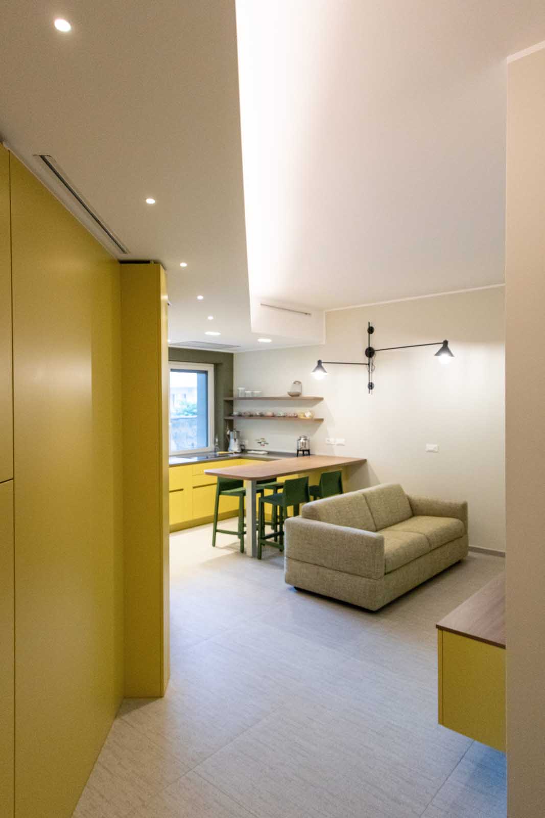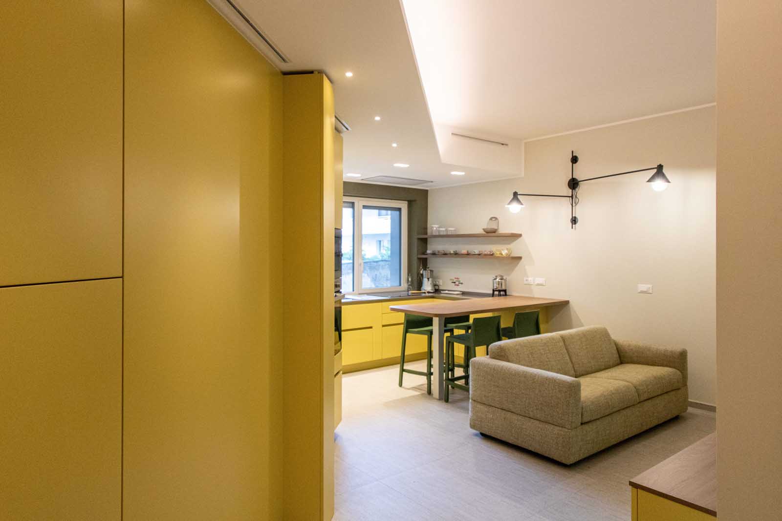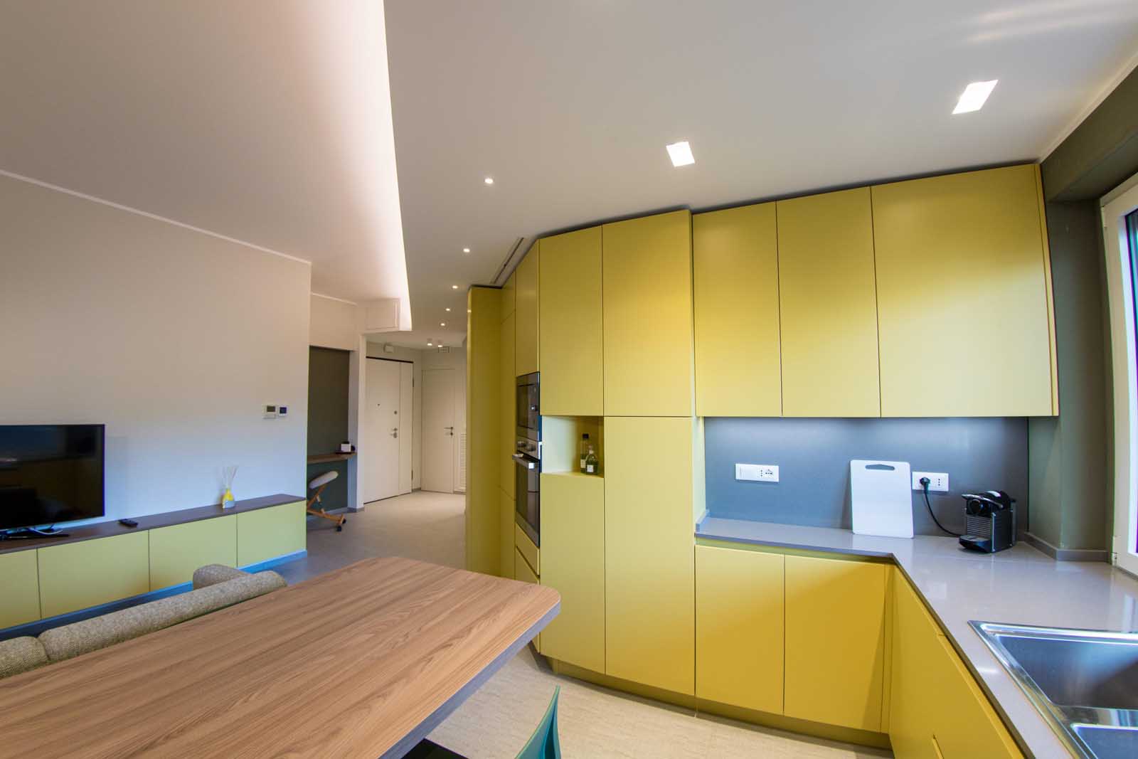 L’abitazione, della superficie complessiva di 67 metri quadrati, presentava una configurazione interna frammentata, con un ingresso privo di luce naturale e un’organizzazione rigida e poco funzionale. Grazie a una progettazione attenta, condivisa e sartoriale, abbiamo completamente ridefinito i volumi interni, operando la demolizione delle partizioni esistenti e proponendo una nuova distribuzione capace di valorizzare ogni ambiente e portare luce, coerenza visiva e continuità.