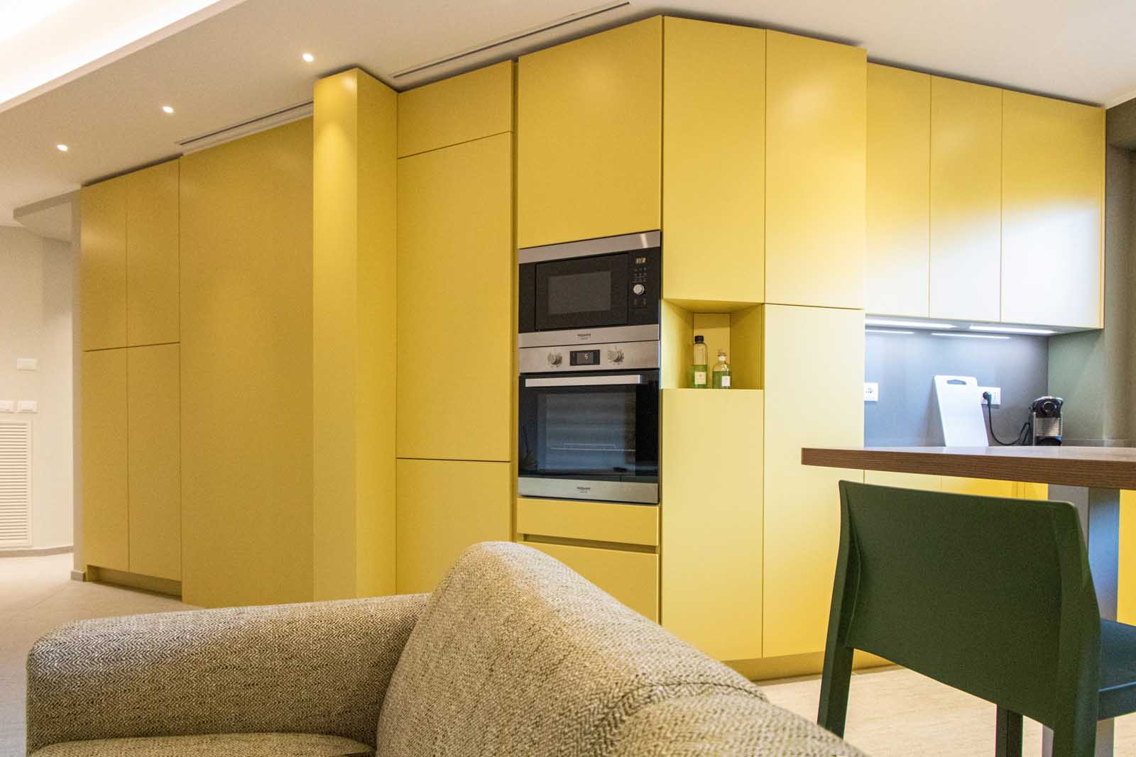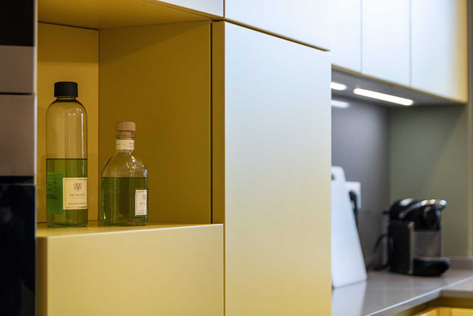 >Gli arredi su misura e le boiserie integrate, soprattutto nella zona giorno e nella cucina, contribuiscono a creare continuità materica e formale, rendendo ogni elemento parte di un unico disegno coerente.